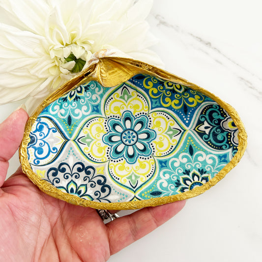 Blue and Yellow Mosaic Decoupage Clam Shell Trinket Dish