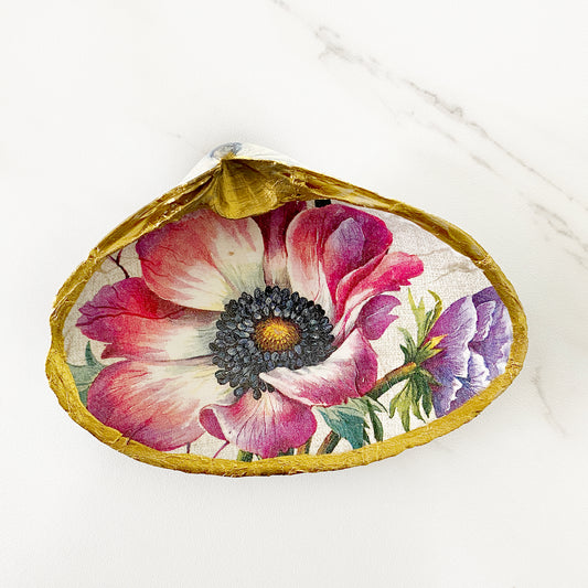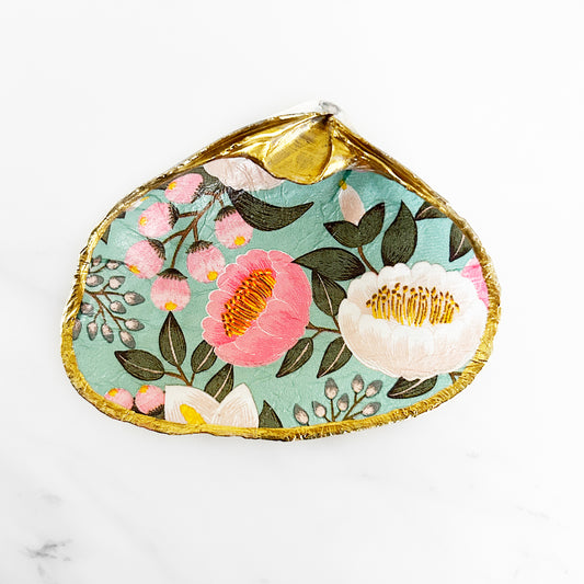 Antique Vintage Blooms Decoupage Clam Shell Trinket Dish