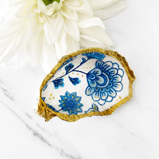 Blue Floral Motif Decoupage Oyster Shell Trinket Dish