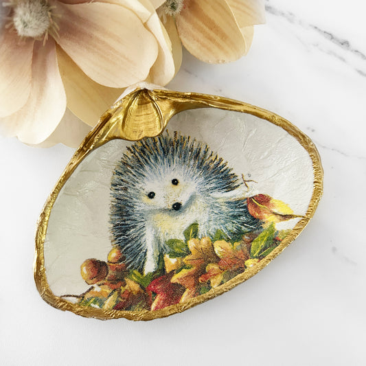 Autumn Hedgehog Decoupage Clam Shell Trinket Dish
