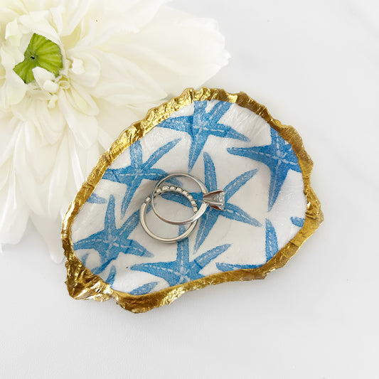Blue Starfish Pattern Decoupage Oyster Shell Trinket Ring Dish