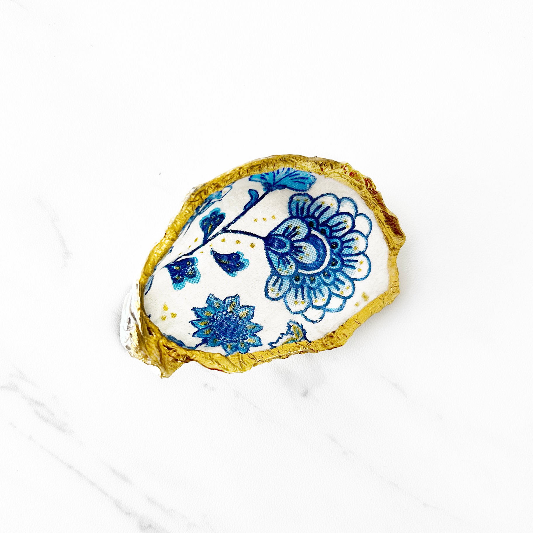 This blue floral motif oyster trinket is made from recycled oyster shells to fit rings or small jewelry pieces. This unique trinket makes a great gift for a loved one or can be a perfect home accent. This decoupage oyster shell is gilded with gold edges. Back of oyster is natural. Recycled oyster shells are one-of-a-kind creations. No two oysters are alike!
