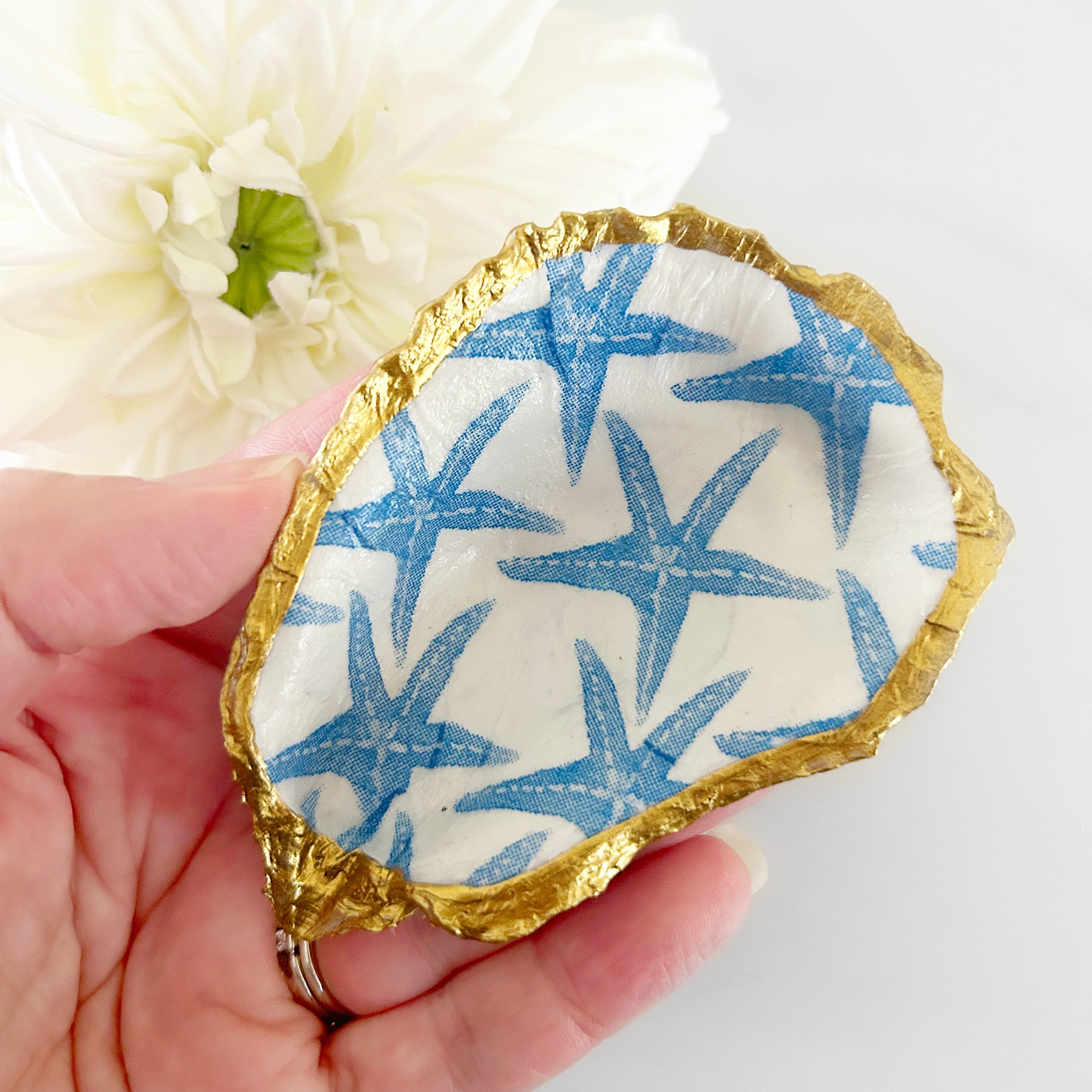 Blue Starfish Pattern Decoupage Oyster Shell Trinket Ring Dish