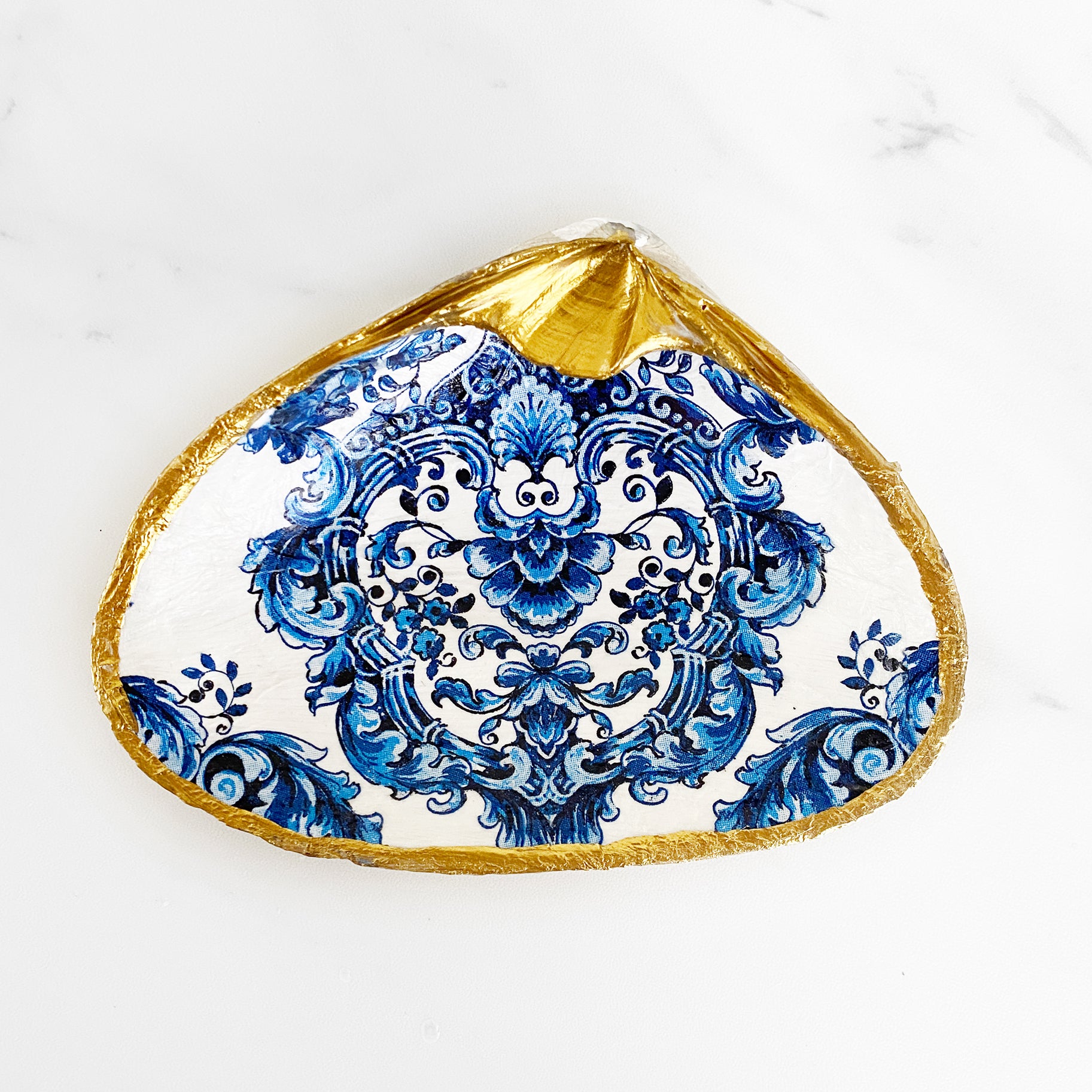Inspired by fine china, this beautiful chinoiserie clam shell trinket dishes features an exquisite design in a bold shades of blue. Chinoiserie inspired trinket ring dishes are perfect for Mother’s Day, Easter, or a gift to brighten someones day. This clam shell trinket dish is made from recycled clam shells to fit your rings or small jewelry pieces. This decoupage clam shell is gilded with gold edges. Back of shell is natural. Recycled shells are one-of-a-kind creations. No two shells are alike!