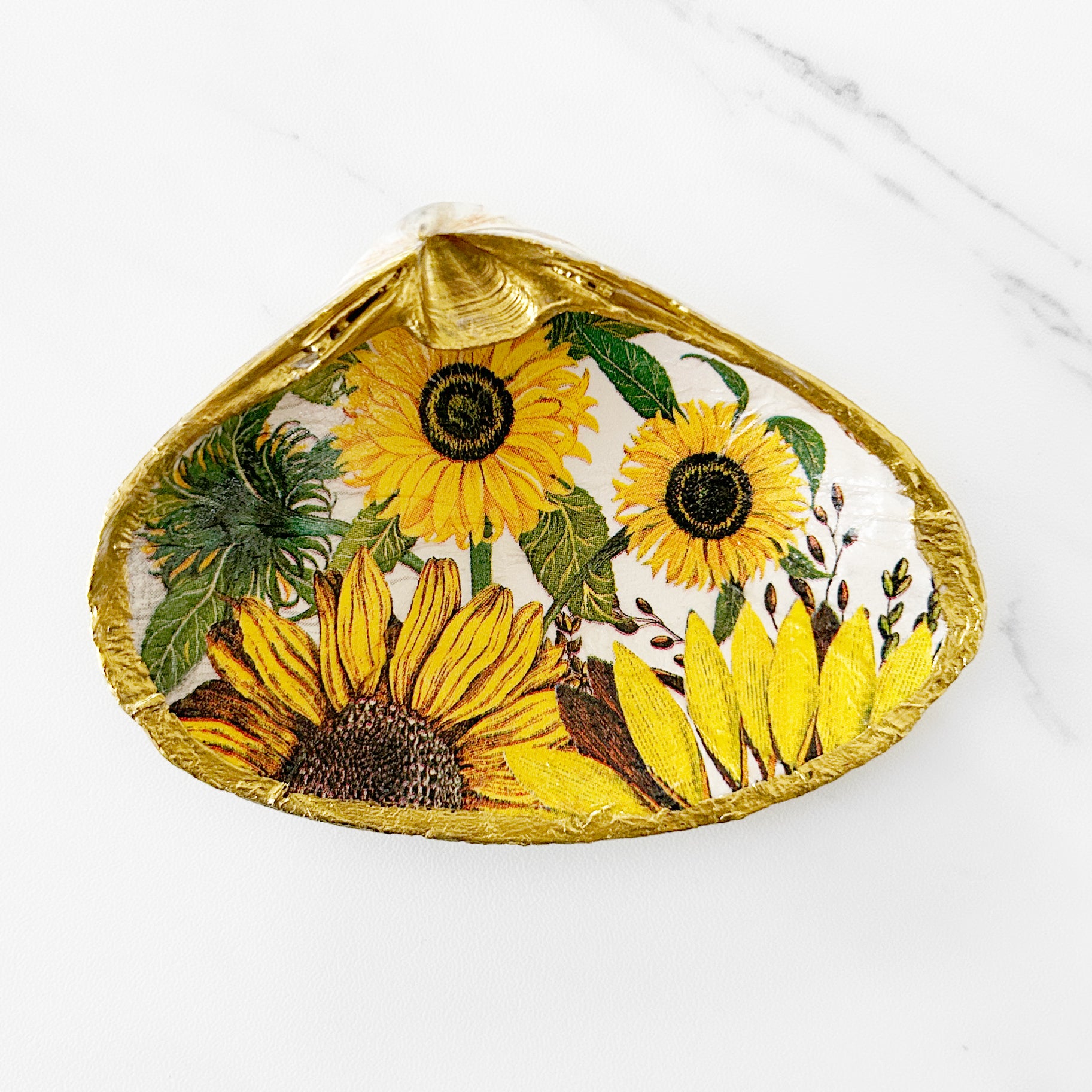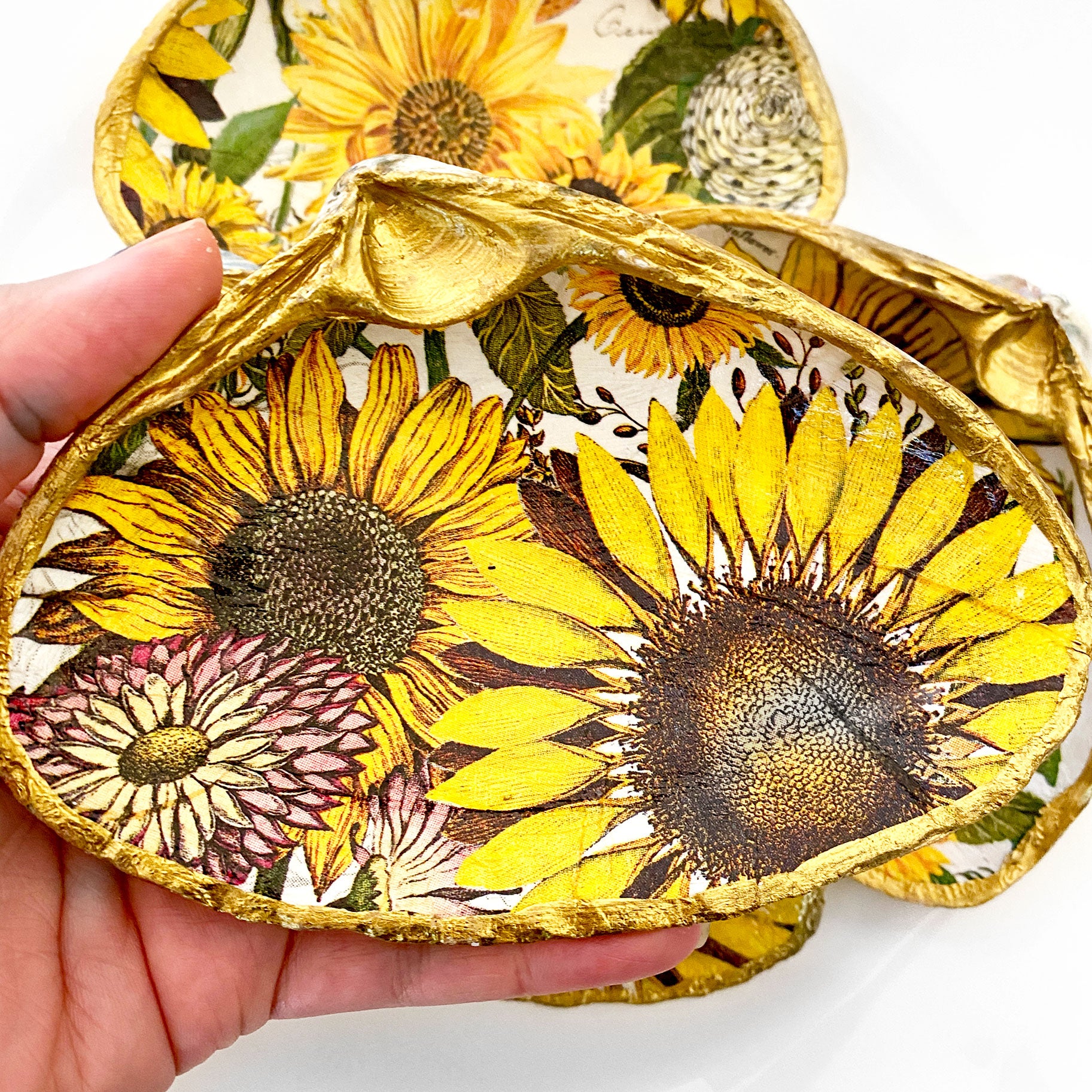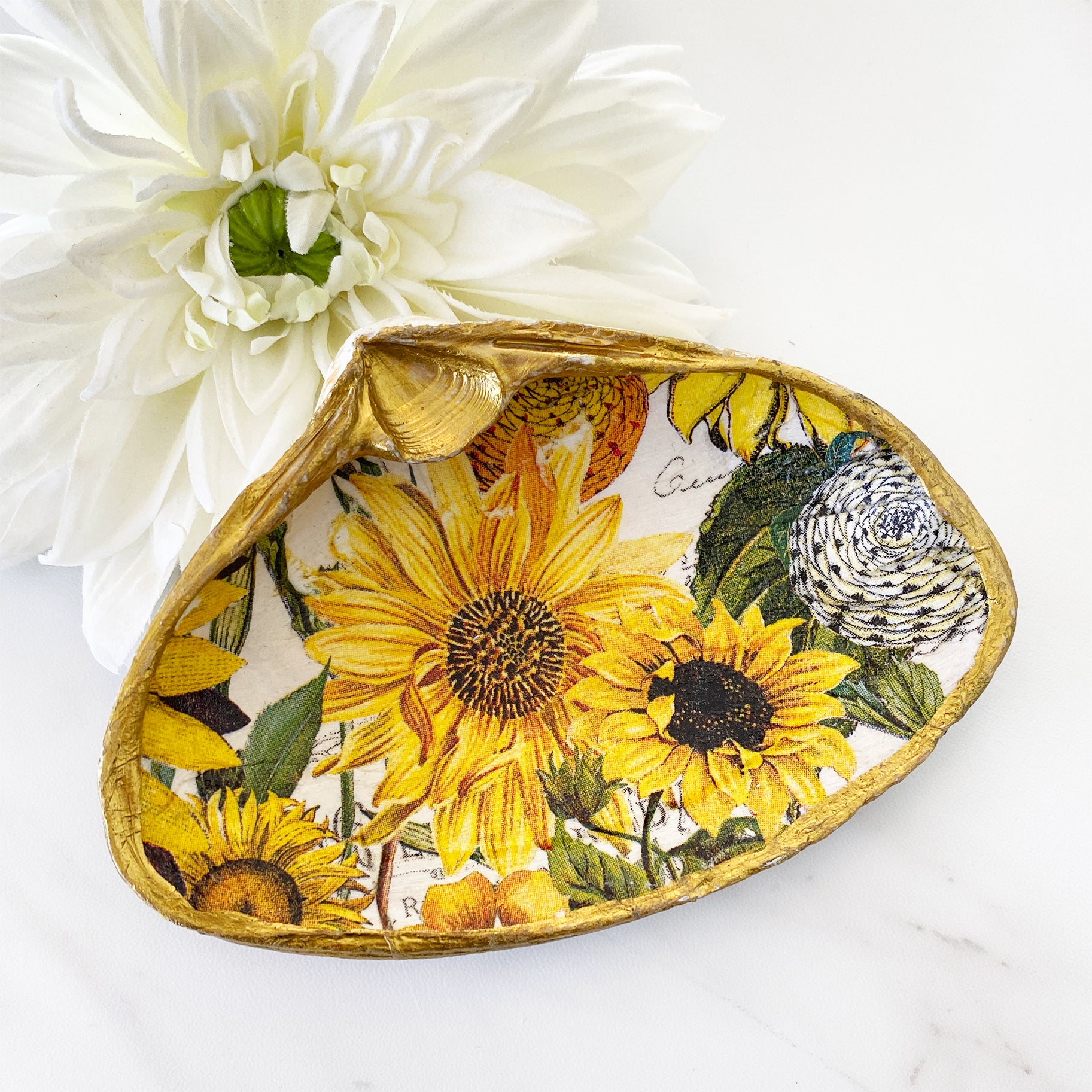 These sunflower trinkets are made from recycled shells and is the perfect storage solution for rings or small jewelry pieces. Also a great wedding gift, birthday gift, or gift for someone special! This decoupage Clam shell is gilded with gold edges. Back of shell is natural. Recycled shells are one-of-a-kind creations. No two shells are alike!