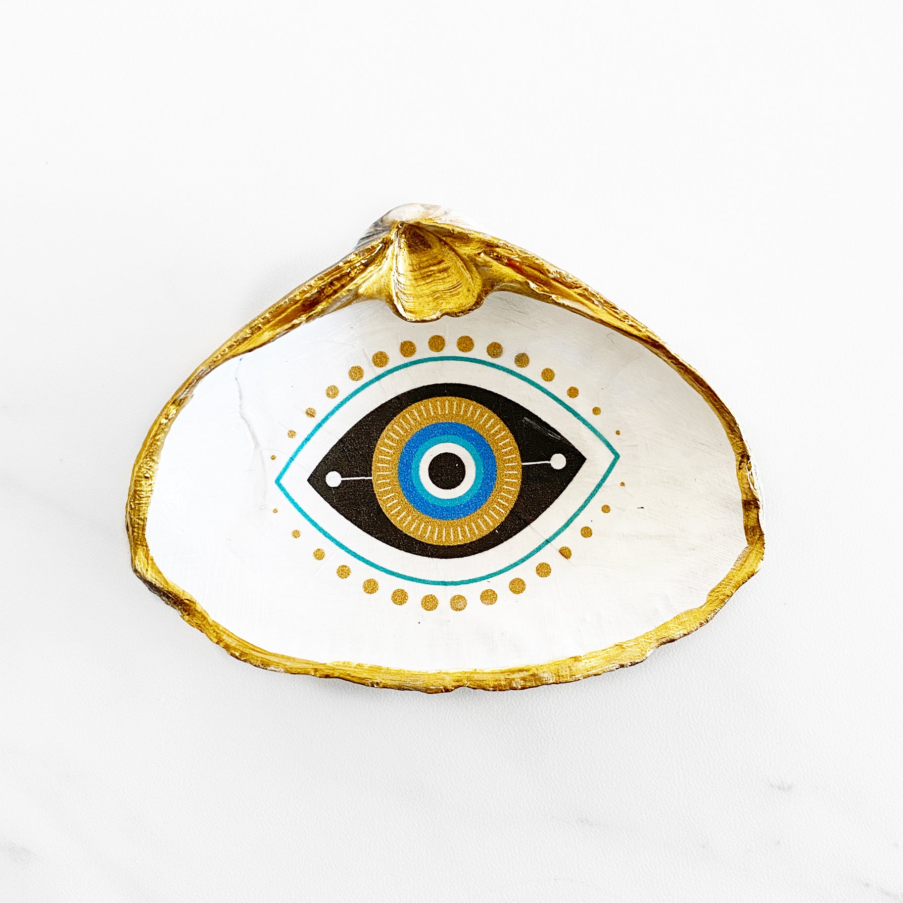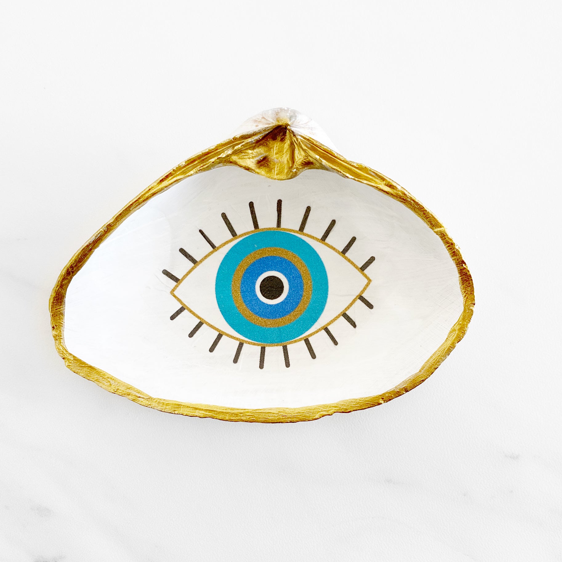 A spiritual gift for protection and good luck . It is believed that someone who achieves great success or recognition also attracts the envy of those around them. This evil eye clam shell trinket dish is made from recycled clam shells to fit your rings or small jewelry pieces. This decoupage clam shell is gilded with gold edges. Back of shell is natural. Recycled shells are one-of-a-kind creations. No two shells are alike!