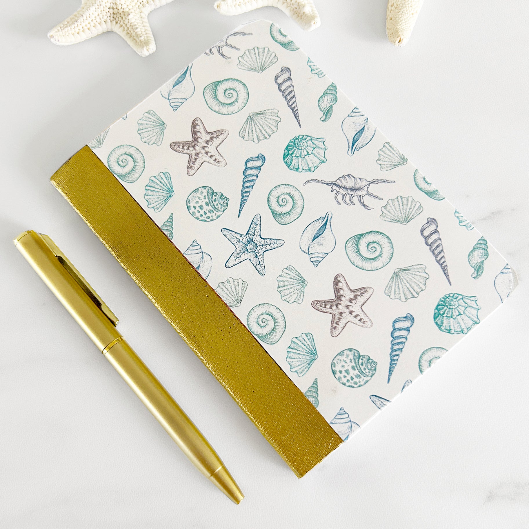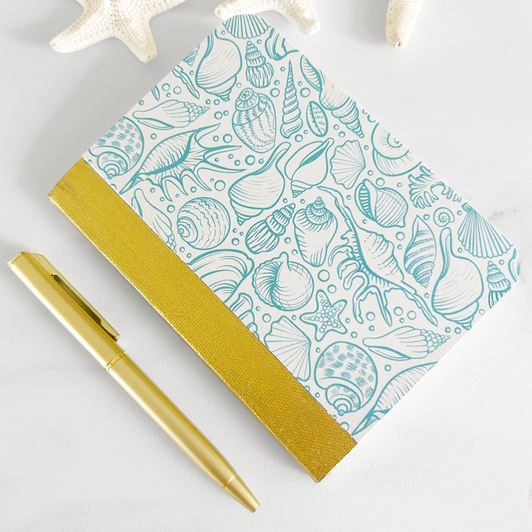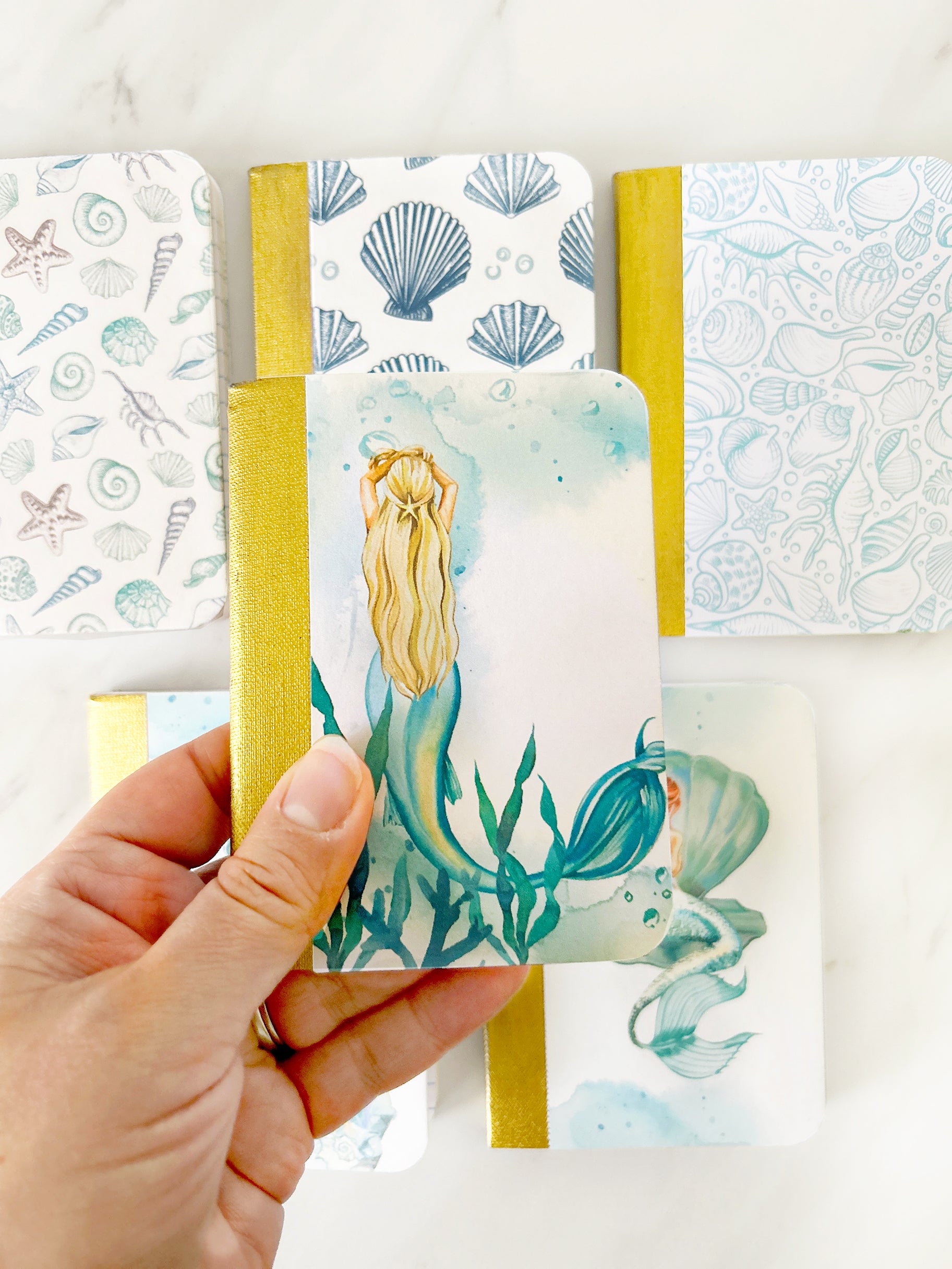 Introducing our ocean-inspired altered mini composition booklets! Each booklet features 80 lined sheets, ideal for note-taking, journaling, or capturing ideas on the fly. Designed for convenience, their compact size makes them a perfect fit for your purse, backpack, or pocket. Choose from one of our six captivating sea life designs. Notebooks are embellished with a satin ribbon and and include a mini gold pen.