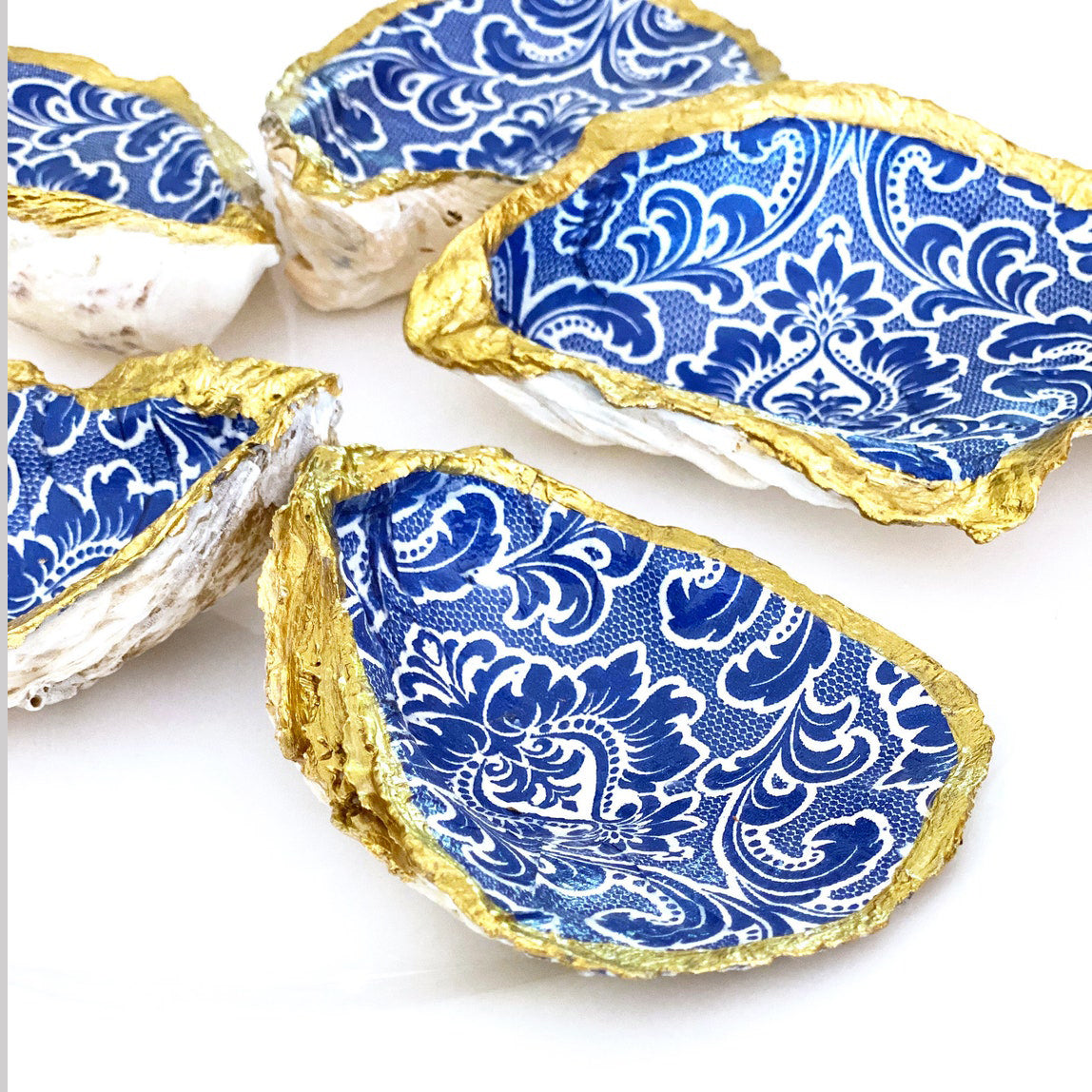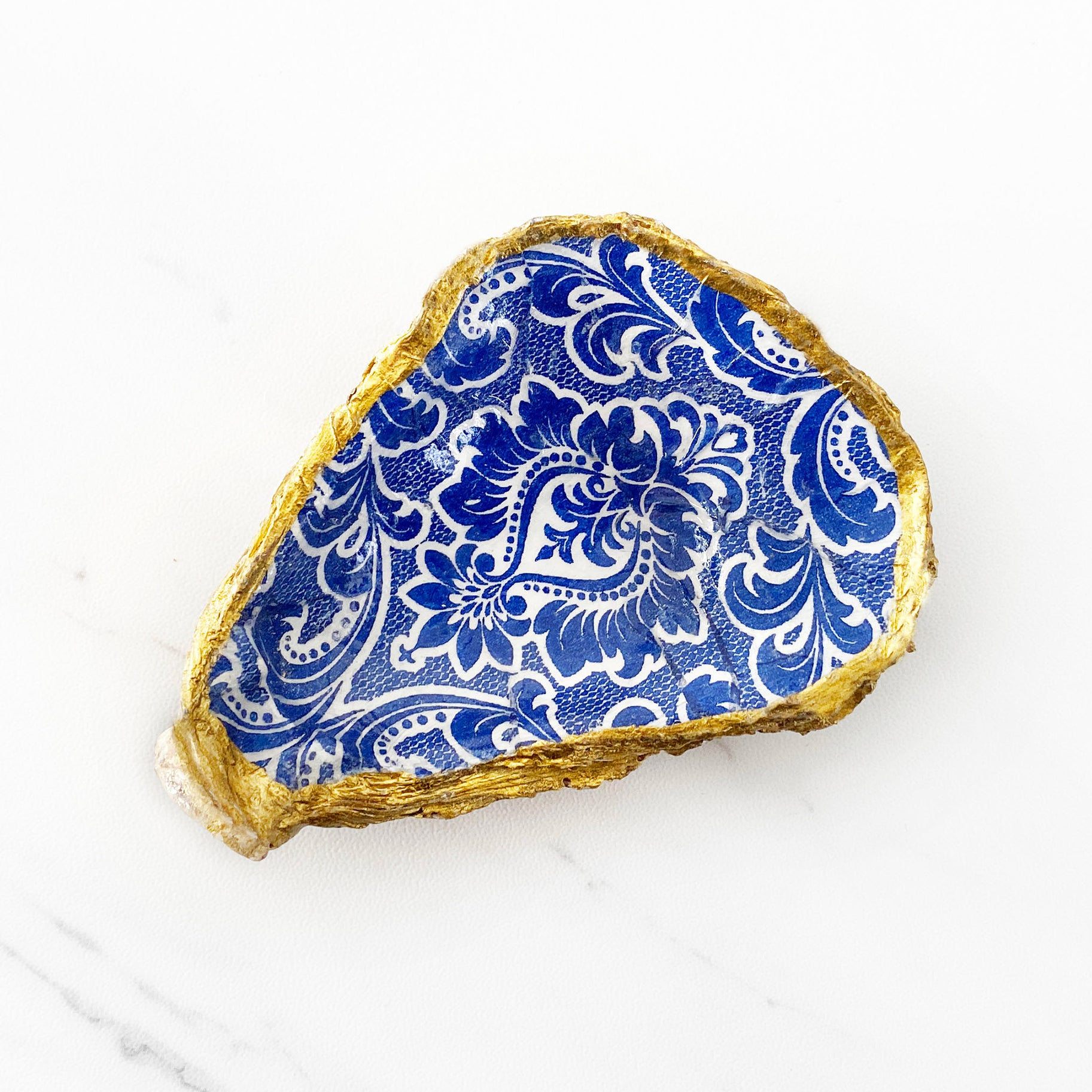 This beautiful blue ornate damask patterned trinket dish is made from recycled oyster shells to fit your rings or small jewelry pieces. Oyster Trinket Dishes make great wedding gifts, birthday gifts, or a gift for someone special! This decoupage Oyster shell is gilded with gold edges. Back of oyster is natural. Recycled oyster shells are one-of-a-kind creations. No two oysters are alike!