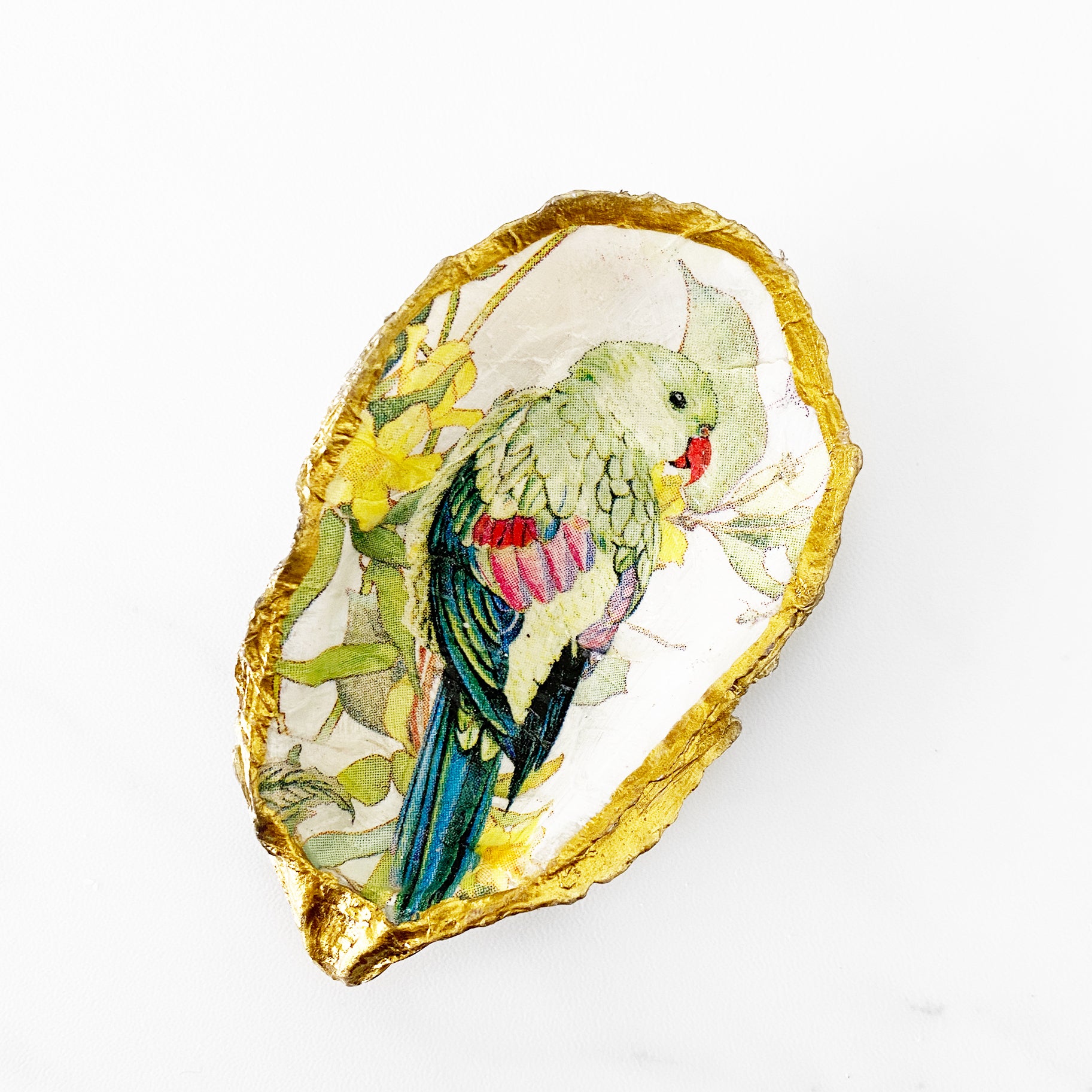 Bring a hint of tropical paradise to your home with a tropical parrot oyster shell trinket dish. This oyster trinket is made from recycled oyster shells to fit your rings or small jewelry pieces. These unique dishes make a great gift for a loved one or can be a perfect accent to your home decor. These decoupage oyster shells are gilded with gold edges. Back of oyster is natural. Recycled oyster shells are one-of-a-kind creations. No two oysters are alike!